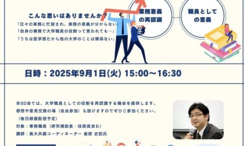 川崎医科大学にて、職員の皆様を対象にしたSD研修の講師を務めさせていただきました。 当日は事務職員の方のほか、研究補助員や技術員の皆様にも多くご参加いただき、今後の大学、今後の大学職員について、様々なデータを交えて一緒に…