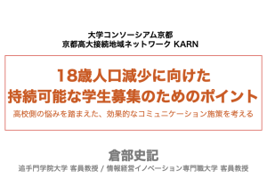 - 高大接続という領域において、こうした格差や不平等を是正することに倉部は務めます。いわゆる難関大学や進学校のためだけの施策ではなく、広くすべての若者と高等教育機関の可能性を拓く業務に取り組み続けます。