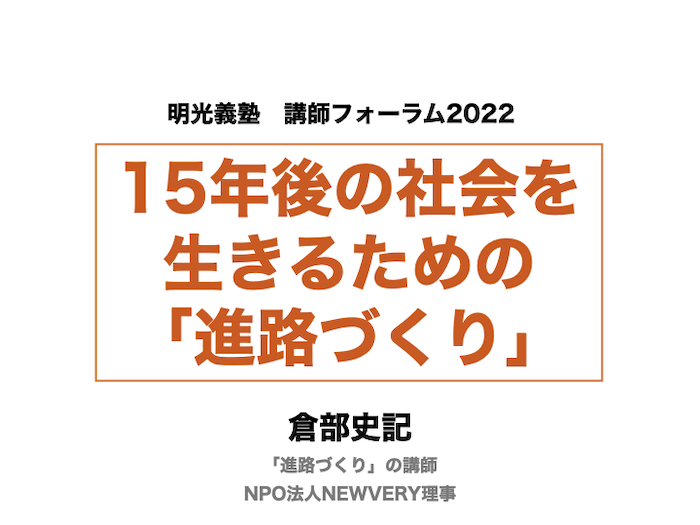 講演・研修2022.05.14 2022.09.09 倉部史記 明光義塾 講師フォーラム2022:「15年後の社会を生きるための「進路づくり」」 明光義塾が講師向けに行う研修「講師フォーラム2022」にて、オンライン講演の講師を担当させていただきました。演題は「15年後の社会を生きるための『進路づくり』」でした。 皆様、ありがとうございました! ツイート シェア はてブ