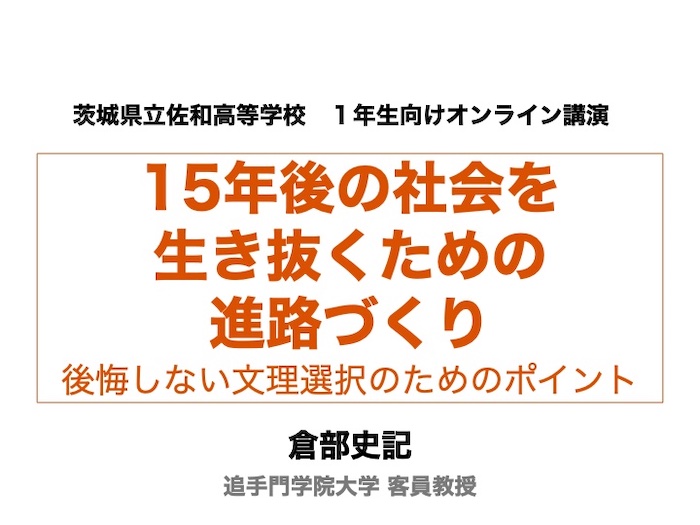 演題は茨城県立佐和高校 1年生向け講演:「15年後の社会を生き抜くための進路づくり 〜後悔しない文理選択のためのポイント〜」でした。皆様、ありがとうございました!