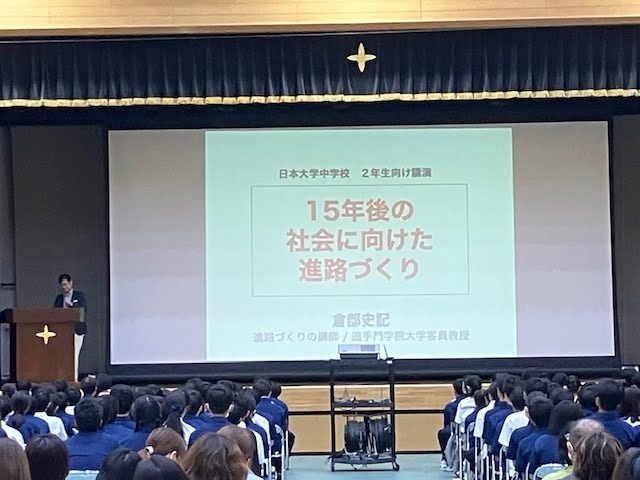 日本大学高等学校・中学校で学ぶ中学2年生、および保護者の皆様を対象にした進路講演をさせていただきました。毎年の恒例行事にしていただいています。