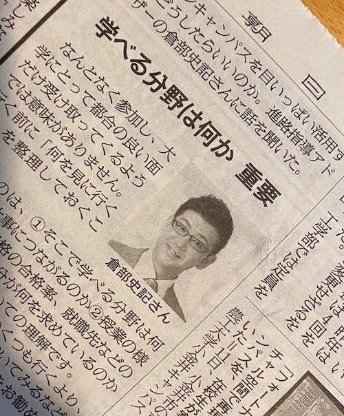 2022年6月18日朝日新聞朝刊の千葉県版、埼玉県版、および6月25日の東京版に、「オープンキャンパスに行こう」という記事が掲載されています。「進路指導アドバイザー 倉部史記さんのアドバイス」という欄にて、倉部のコメントを掲載していただきました。